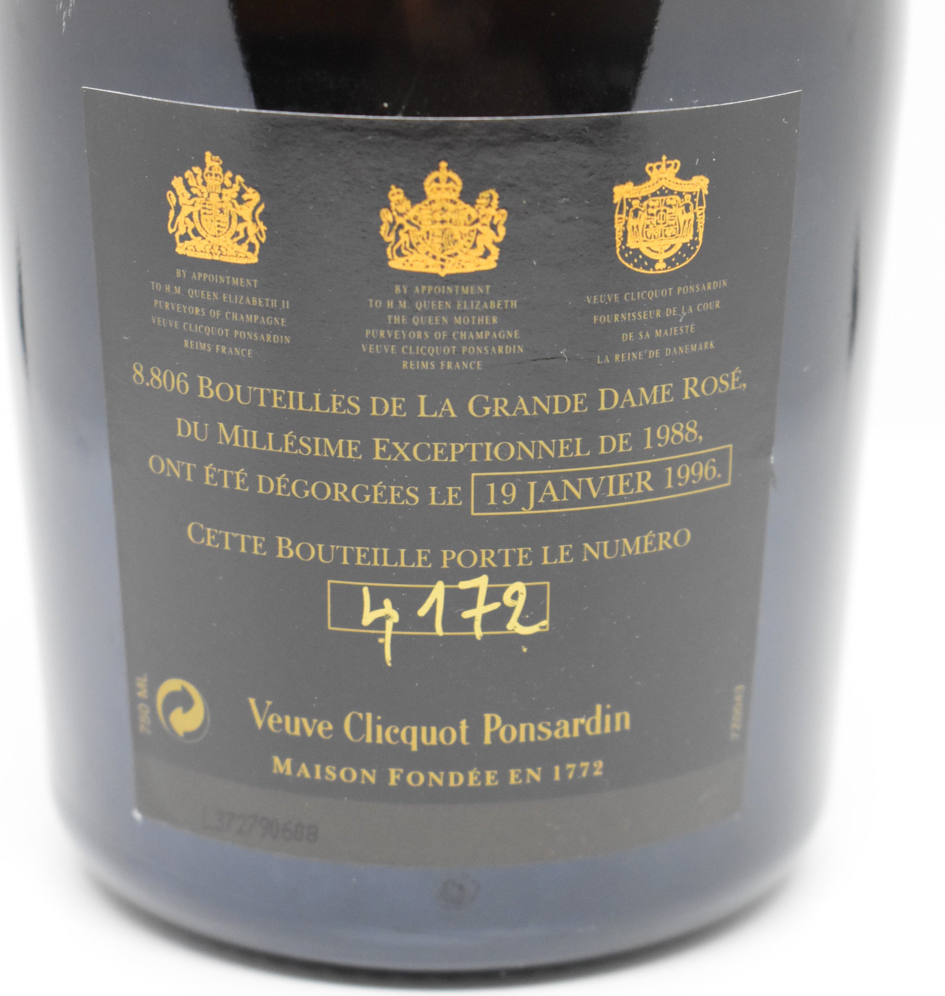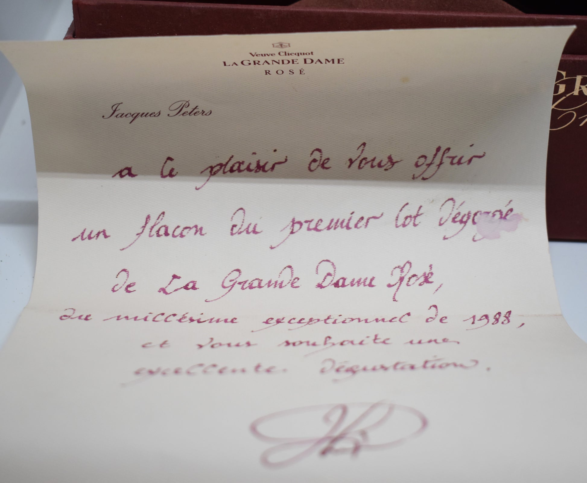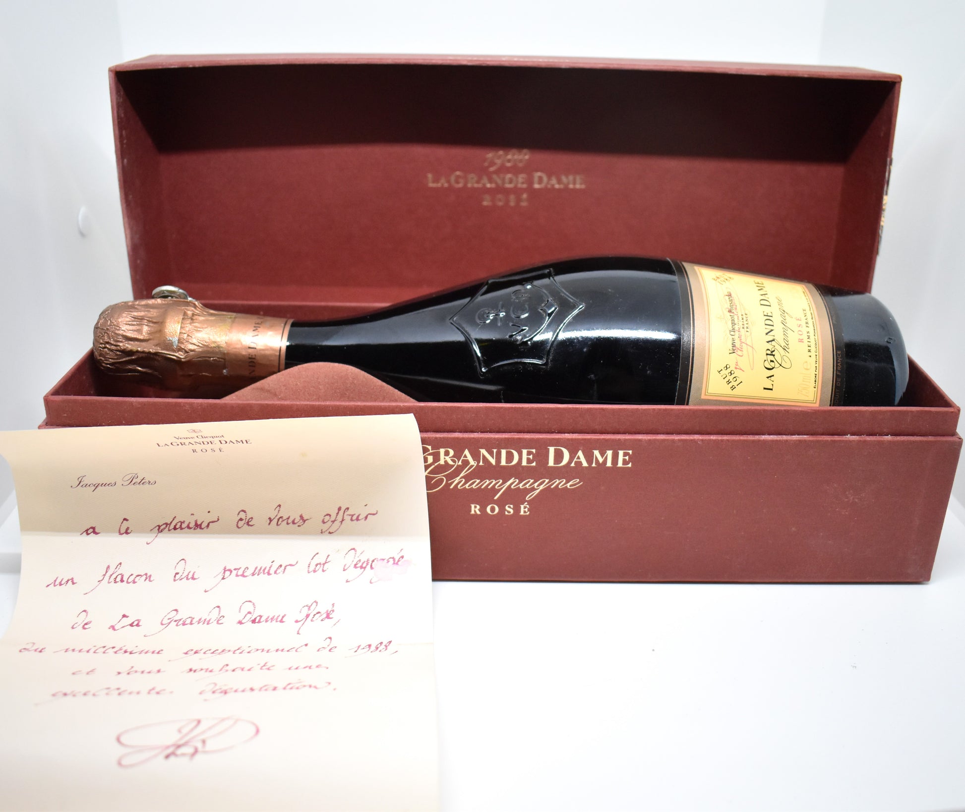 A unique jewel in the history of Veuve Clicquot, this iconic cuvée represents the essence of age-worthy Champagne in its rosé version. The example presented here is made even more precious by a handwritten dedication from Jacques Péters, one of the most respected cellar masters in Veuve Clicquot's history. This bottle from the first disgorged batch offers a piece of history, both in its contents and its exclusive packaging.